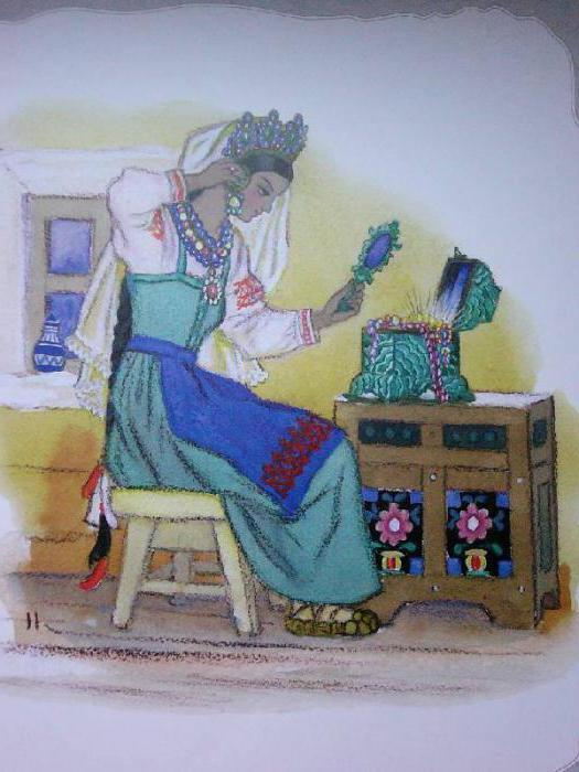 Главные герои Другие персонажи Краткое содержание После смерти мужа – известного в округе горняка Степана – у Настасьи осталась малахитовая шкатулка с богатыми украшениями, которая досталась им в подарок от самой Хозяйки Медной горы. Она знала истинную цену этим драгоценностям, и даже в самое тяжелое время отказывалась продавать их местным торгашам. У Настасьи было трое детей: двое парнишек и младшенькая, Танюшка. Девочка с ранних лет привлекала к себе внимание непривычной для здешних мест красотой – «сама черненька да басенька, а глазки зелененьки». Танюшка с детства привыкла играть украшениями из малахитовой шкатулки, а когда подросла, то стала носить их – они подходили ей, как никакой другой красавице. К тому времени Танюшка «научилась шелками да бисером шить», да так, что даже самые опытные мастерицы диву давались. Научила же Танюшку рукоделию нищая странница, что попросилась у Настасьи немного пожить, передохнуть с дальней дороги. И что интересно: Танюшка и со своими близкими бы