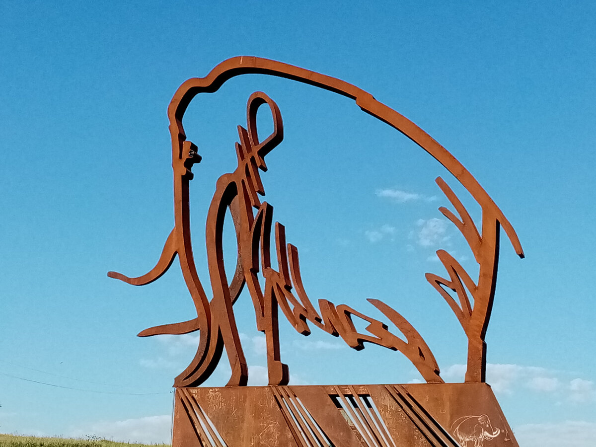 Проскочив заброшенные фруктовые сады, вы, буквально, наткнетесь на мощную металлоконструкцию в виде мамонта. Еще год назад здесь было пустое плато, а теперь его занял красавец-гигант. Кстати, возможно, так было задумано авторами, но... Металл дал ржавчину, и зверь в таком «колоре» смотрится очень естественно. На его темно-рыжей шубе уже есть надписи (кто был, когда...) и даже рисунок мамонтенка. Кстати, видно, что рисовали кусочком меловой породы. Ее здесь видимо-невидимо. Стоит отметить, что скульптура установлена на одной из высоких точек, откуда открывается обзор на Дон, засеянные поля и видно больше половины населенного пункта.