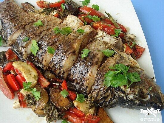 Ингредиенты: • 1 карп • 2 луковицы • 1 морковка • 1 помидор • 50 г сливок • 2 ст. л. подсолнечного масла • соль, перец • 1 лавровый лист Приготовление: • Рыбу почистить, сделайте поперечные надрезы по длине всей тушке. Натрите солью и перцем. • Лук нарежьте полукольцами, морковку натрите на терке и поставьте тушиться на масле на 5 минут. • Половину тушеных овощей выложите на дно формы для запекания, оставшимися овощами нафаршируйте карпа • Запекайте рыбу в духовке 15 минут при температуре 180 °С • Нарежьте помидор кольцами и выложите на рыбу, после чего запекайте еще 5-10 минут. • За пять минут до готовности полейте запеченного карпа сливками.