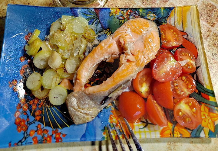 Хочу поделиться простым в приготовлении и вкусным ужином. Стейк форели (можно и другой «малокостлявой» рыбы), тушеный с луком-пореем, плюс помидорки черри и холодный зеленый чай с лимоном. КБЖУ – 166/24/5,2/5,7. ХЕ – 0,5. Масса – примерно 400 г. Хорошо разогреваем антипригарную сковородку и припекаем рыбку по 1 минуте с двух сторон. Добавляем в сковородку 3-4 ложки воды, чайную ложку растительного масла, чуть присаливаем, добавляем лук-порей (можно и обычный лук). Тушим минут 7-10 (или до выпаривания воды) под крышкой на медленном огне. Уже на тарелке взбрызнула лимонным соком. Чай обычный, зеленый. Завариваю в кувшине, добавляю лимон, если есть - мяту и держу в холодильнике. Иногда разливаю в полулитровые бутылки, и тоже храню в холодильнике. В бутылочке удобно брать с собой на прогулку. Это порция для меня. СД2. Всем хорошего настроения, здоровья, и позитива. Больше общения и рецептов - в группе "Рецепты для диабетиков" в ВКонтакте! Рецепт на странице Автор рецепта – Лиля Телешова