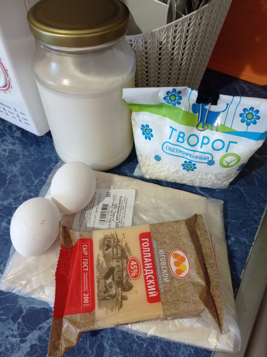 Доброго времени суток, дорогие читатели. Хочу поделиться с вами очередным крутым рецептом. Рецепт легкий, белковый, без использования муки, но не без углеводов, с минимумом заморочек. В общем, как я люблю. Что такое ачма и что она из себя представляет? Ачма – грузинский слоеный пирог с сыром, готовится из большого количества слоёв теста, которое предварительно отваривают. В качестве начинки традиционно используется рассольный имеретинский сыр. Главный принцип приготовления ачмы — тесто несладкое, а сыр — соленый. Употребляется ачма, как правило, в горячем виде. Удобна тем, что ее можно разогревать повторно — она от этого нисколько не теряет во вкусе. Считается праздничным блюдом, поэтому обычно ее готовят сразу большими противнями. В нашем случае рецепт максимально упрощен и слово "ленивая" в названии полностью себя оправдывает. Для приготовления нам понадобятся: По количеству все ингредиенты указаны ниже. Для начала смешиваем творог, молоко и яйца. Хорошо все перемешиваем, творог ра