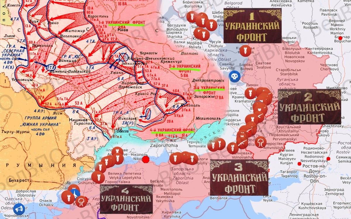 Под умелым руководством Ставки Верховного главного командования и командующих этими фронтами украинская территория была освобождена от «фашисткой падали». Сегодня. Учитывая складывающуюся оперативную обстановку на Украине, «прилетающие» ракеты по объектам критической инфраструктуры России, гибель мирных жителей, Президент РФ Владимир Путины выступил с обращением к российскому народу и объявил частичную мобилизацию. Настало время отойти от вялотекущего, исключительно гуманного процесса ведения т.н. СВО, достать наконец-то штандарты прославленных оперативно-стратегических объединений Красной армии, создать ставку ВГК и освободить уже на всегда украинскую землю от почитателей Гитлера и Бандеры, от НАТОвских инструкторов и наемников, что бы нацисты с «мертвой головой» на шевроне больше никогда не топтали русскую землю.