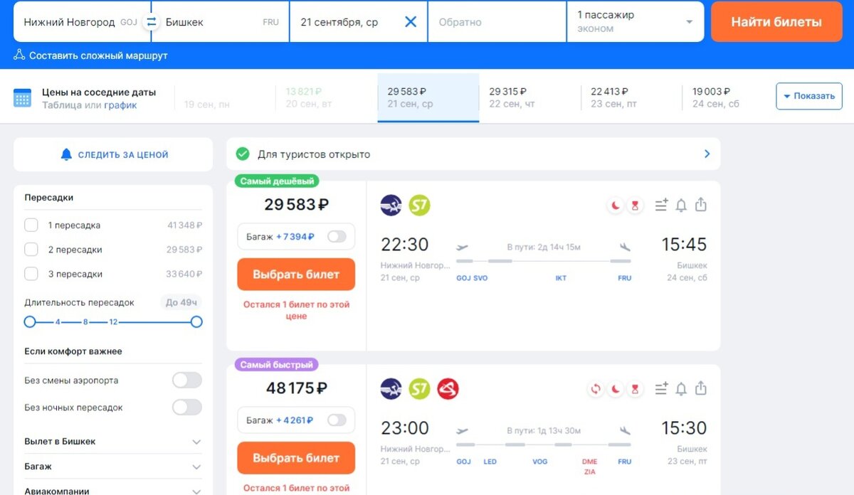 В некоторые страны можно улететь не раньше 23 сентября. Билеты за рубеж из Нижнего Новгорода заметно подорожали, сообщается на сайте Aviasales. В настоящий момент загранпаспорт не требуется для въезда в Армению, Беларусь, Кыргызстан и Казахстан. Согласно данным сайта, билеты на 21 сентября еще можно купить в Бишкек за 29 тысяч рублей. 22 сентября нижегородцы смогут улететь с пересадками в Минск, при этом билеты можно купить за 21−50 тысяч рублей. Также еще есть несколько билетов в Астану (Казахстан) за 41,5 тысяч рублей. При этом билетов в Ереван (Армения) уже нет. Их можно приобрести только на 23 сентября. Цены стартуют от 67 тысяч рублей. Также нижегородцы не смогут до 23 сентября улететь в Анталью (Турция), где потребуется загранпаспорт. Билеты на пятничный рейс продаются за 213 тысяч рублей соответственно. При этом в Стамбул еще можно улететь 22 сентября за 80 тысяч рублей. А билеты в Баку (Азербайджан) на 23 сентября продаются за 103 тысячи рублей. Примечательно, что есть билеты и
