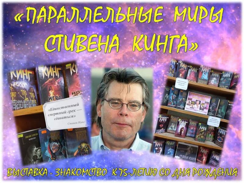 На абонементе отдела обслуживания учащихся среднего и старшего возраста представлена выставка-знакомство «Параллельные миры Стивена Кинга», посвященная 75 – летию со дня рождения одного из самых известных и популярных писателей XX- XXI веков. Стивен Кинг - признанный «король ужасов», его произведения написаны в жанре хоррор. Он автор 60 романов, 200 рассказов, большинство из которых были собраны в десять авторских сборников и пяти книг на научно-популярную тематику. Его книги продаются миллионными тиражами и пользуются неизменным успехом у читателей разных поколений. Книги, выходящие из-под его пера, наполнены таинственной и мрачной атмосферой, леденящими кровь событиями и захватывающими приключениями. Это коктейль разнообразных жанров: ужасов, триллеров, фантастики и фэнтези, мистики и детективов, сюжеты которых завораживают необыкновенным воображением и буйной фантазией, поэтому являются неисчерпаемым кладезем вдохновени