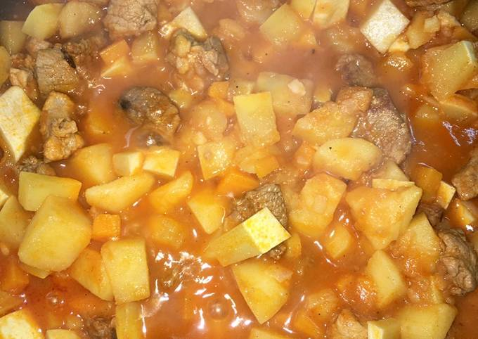 300 г свинины, 2 молодых кабачка, 2–3 картофелины, 2 головки репчатого лука, 3 зубчика чеснока, 1 пучок зелени, 150 мл бульона или воды, топленый жир для жарки, соль и свежемолотый черный перец по вкусу Мясо мелко нарезать. Кабачки и картофель очистить, нарезать кубиками, лук – полукольцами. Зелень мелко нарубить. Обжарить на сковороде мясо, добавить лук, жарить несколько минут. Переложить в толстостенный казанок. В той же сковороде обжарить картофель, выложить на мясо, посыпать рубленым чесноком. Сверху распределить кабачки, посолить, поперчить, посыпать зеленью. Влить бульон. Тушить под крышкой на слабом огне до готовности (около 1 часа).