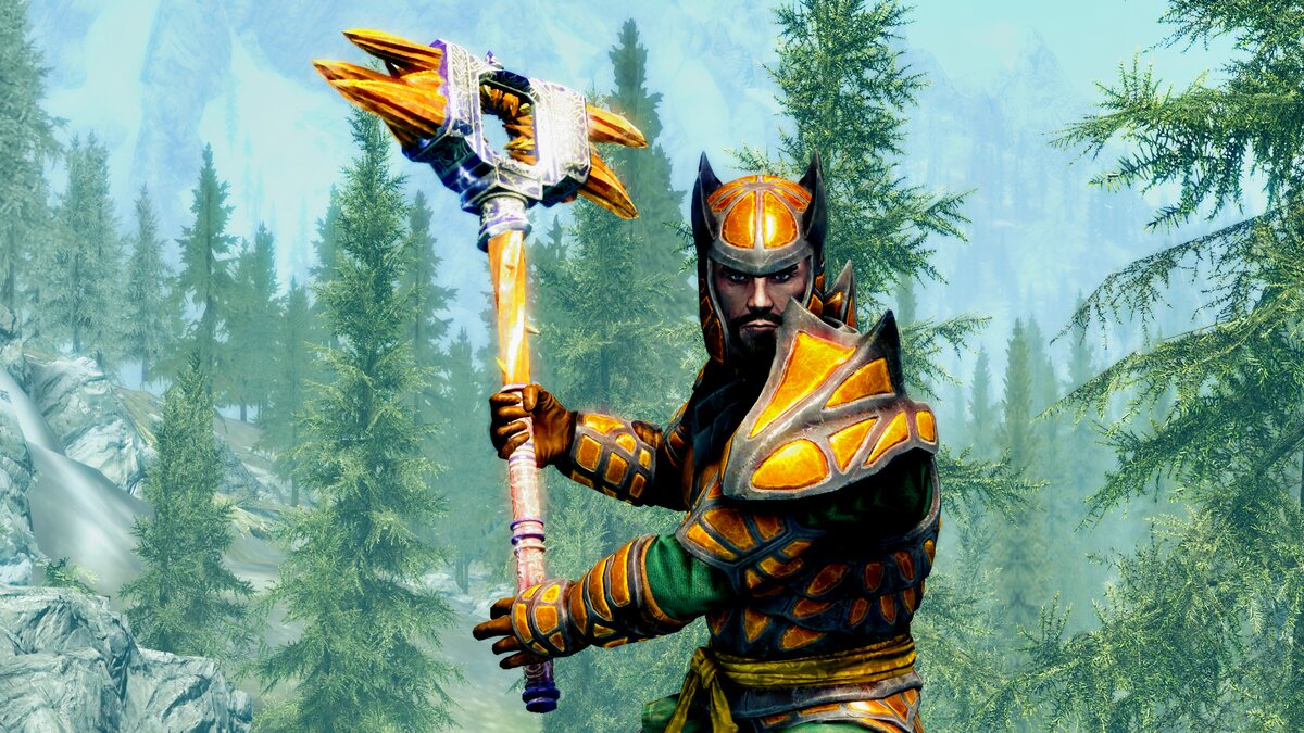Выполнив условия завещания, Довакин становится обладателем огромадного необычного молота, который хорошо сочетается с янтарной бронёй.