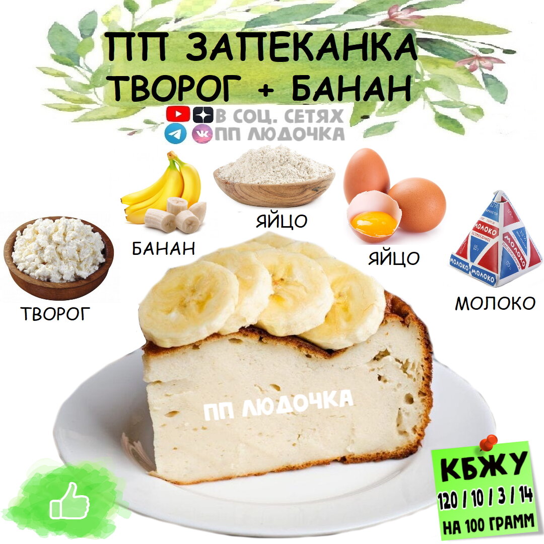 Бесконечно спасибо за лайки и подписки 💚 Для вкусного и полезного завтрака, хорошего настроения и хорошей фигуры 🔥👌🏻 📝 КБЖУ на 100 г. = 120 / 10 / 3 / 14 ⭐️ Сложность (1 из 5) ⏰ Время приготовления: 40 минут ✅ ИНГРЕДИЕНТЫ: 🍌 Творог - 200 г. 🍌 Яйцо - 2 шт. 🍌 Банан - 1 шт. 🍌 Сахарозаменитель - по вкусу 🍌 Рисовая мука - 2.5 ст.л. 🍌 Молоко - 5 ст.л. ✅ ПРИГОТОВЛЕНИЕ: Творог, яйца, сахарозаменитель и банан блендерим в пюре. Добавляем молоко, рисовую муку и хорошо перемешиваем. Выливаем в форму небольшую (у меня это ~20*15см.) Ставим в разогретую духовку на 180 градусов и готовим 30-35 минут.