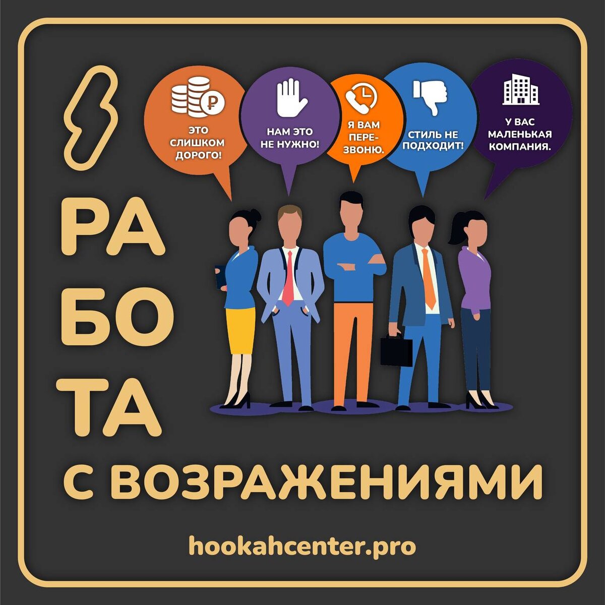 Возражения — триггер, который подсказывает, как выстраивать диалог. Поэтому отработка возражений — важный навык, необходимый для успешных продаж. 5 основных шагов к отработке возращений: • Выслушайте и поймите клиента; • Будьте на «его стороне»; • Отработайте возражение; • Уточните, остались ли вопросы. Почему мы не говорим о готовых скриптах? Потому что к каждому клиенту нужен индивидуальный подход. 7 проверенных техник для «борьбы» с возражениями: • Вопросы - задавайте их, чтобы лучше понять потребность клиента; • Аргументация - расскажите о преимуществах в разрезе выгоды; • Применяйте «а что если…» - после этих слов укажите на какую-то выгоду, которую он может получить от сделки; • Применяйте «именно поэтому» - это выражение превращает возражение клиента в аргумент в вашу пользу. Относитесь к возражениям положительно! Правильная коммуникация с клиентом - это часть успешных продаж. HOOKAHCENTER.PRO