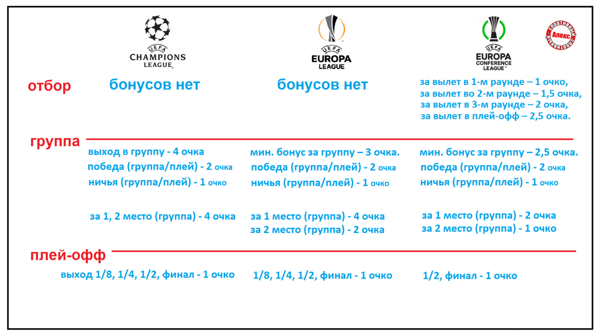 Вчера мне написали во вконтакте сообщение: нет ли у вас на канале видео, как начисляются очки в рейтинге клубов? Я нашёл систему подсчета рейтинга сборных ФИФА, таблицы коэффициентов УЕФА, а ролик с клубным рейтингом устарел. Сегодня исправляю данное недоразумение и приведу подробный пример с Шерифом, Марселем и Ромой. Для чего же нужен рейтинг? Прежде всего, узнать, кто лучший, а также, чтобы не допустить скопления сильных соперников в одной группе. Любой клуб, участвующий в еврокубках попадает в рейтинг УЕФА. Очки могут начисляться двумя способами. 1) Бонусы за выход в определённую стадию. 2) За результат. Рассмотрим, как начисляются очки в трех разных турнирах. Сначала квалификация. В Лиге Чемпионов и в Лиге Европы бонусы за отбор отменены. В Лиге Конференций за вылет в 1-м раунде – 1 очко, за вылет во 2-м раунде – 1,5 очка, за вылет в 3-м раунде – 2 очка, за вылет в плей-офф – 2,5 очка. Групповой этап. Любая команда получает четыре очка за выход в групповой этап Лиги Чемпионов. В Л