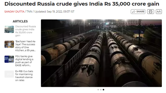 Автор - Koren'2 # В продолжение темы Россия-Индия. К вопросу на сколько Индии выгодно сотрудничество в нефтегазовой сфере. Согласно сообщению The Times of India от 19 сентября, люди, знакомые с этим вопросом, сообщили, что с момента начала российско-украинского конфликта в феврале этого года практика покупки больших объемов российской нефти со скидкой позволила сэкономить Индии 350 млрд рупий (около 4,4 млрд долларов США). Некоторые покупатели избегают российскую нефть, опасаясь западных санкций, что позволяет Индии получать скидки. Хотя Соединенные Штаты и другие западные страны оказывали давление на Индию, чтобы она не импортировала нефть из России, Индия по-прежнему предпочитает это делать. В настоящее время Индия стала вторым крупнейшим покупателем российской нефти после Китая. Нефть из России составляет 12 процентов от общего объема импорта нефти в Индию, по сравнению с менее чем 1 процентом до российско-украинского конфликта. В какой-то момент в июле этого года Россия даже