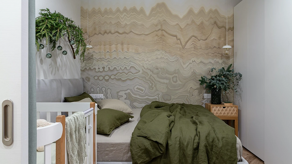 Заказчики поставили следующие задачи: выделить спальню, удобную зону кухни и комфортную гостиную. А самое главное — подготовить квартиру к рождению ребенка. Для этого дизайнер заранее оформила в комнате родителей детский уголок с кроваткой. Особое внимание уделили системам хранения: сделали шкафы на заказ и установили на балконе стеллажи для сезонных вещей.