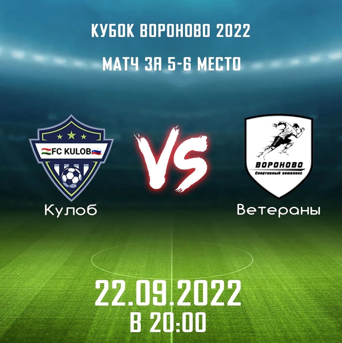22.09.2022 года (Четверг) в п. Вороновское пройдёт матч за 5-6 место "Кубка Вороново" по футболу среди мужчин. Матч пройдёт на футбольном поле на территории МБУ "Спортивный комплекс "Вороново". Расписание: 22.09.2022 года (Четверг) в 20:00 матч за 5-6 место Ветераны (Вороновское) - Кулоб (Вороновское) Ждём всех любителей футбола поболеть за команды. #мбусквороново #кубоквороново #футбол