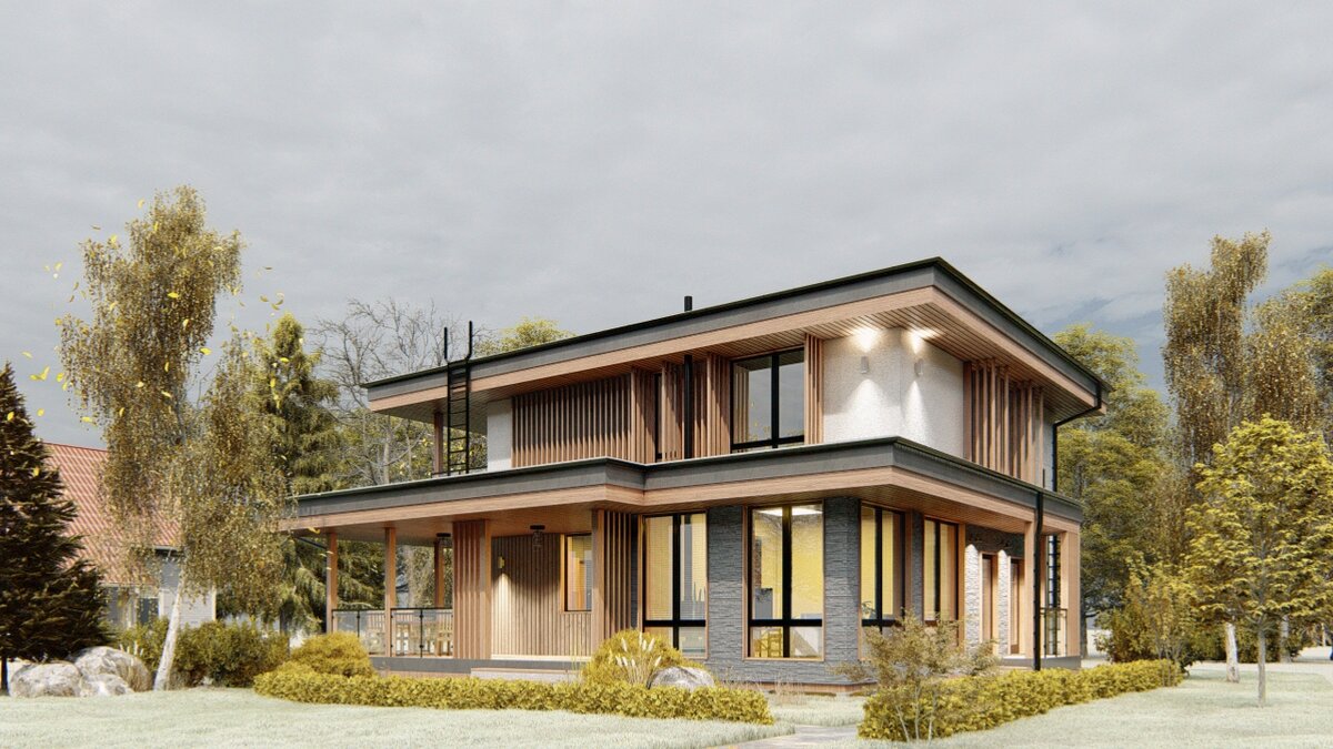Этот проект сочетает в себе самые современные технологии загородного домостроения, в том числе: архитектурный стиль хай-тек, панорамное остекление и плоская каркасная кровля. По своим габаритам двухэтажный загородный особняк (200 м2) подойдет для любого участка.