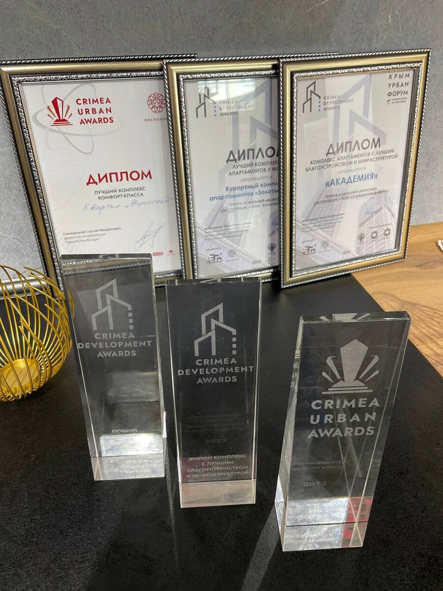 Три проекта Группы компаний «Монолит» получили награды и дипломы в сфере урбанистики CRIMEA URBAN AWARDS и ежегодной профильной премии CRIMEA DEVELOPMENT AWARDS «Премия Застройщик Крыма2022». Премии вручили в рамках масштабного «Крым Урбан Форума» - первой международной конференции по комплексному развитию территорий Крыма. Мероприятие проводилось при поддержке и участии Министерства строительства и архитектуры Республики Крым, Комитета Государственного Совета Республики Крым по строительству, транспорту и топливно-энергетическому комплексу, а также Ассоциации застройщиков Республики Крым.