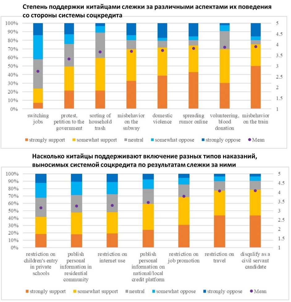 - На верхней показано, что китайцы весьма благосклонно относятся, например, к слежке за их поведением на транспорте и их участию в волонтерской деятельности. Однако, как только доходит, например, до отслеживания их смены работы, поддержка китайцев резко падает. И желание протестовать против подобной слежки проявляют до 20% населения.