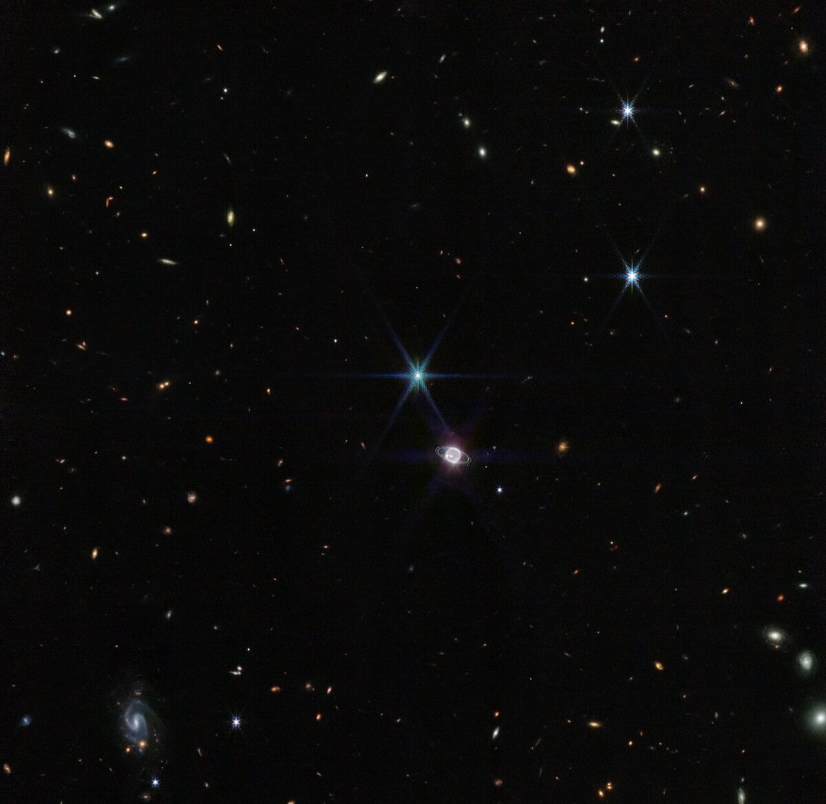 Орбитальная обсерватория «Джеймс Уэбб» сделала рекордно чёткие изображения газопылевых колец, окружающих Нептун, самый далекий от Солнца газовый гигант, и фотографии половины его спутников. Эти снимки помогут учёным раскрыть историю формирования колец и лун Нептуна. «Первые снимки колец Нептуна, полученные [от] "Джеймса Уэбба", поражают своей чёткостью. Многие из них не были видны на фотографиях со времён пролёта "Вояджера-2" через окрестности Нептуна в 1989 году. Эти снимки позволили нам взглянуть на Нептун и его кольца и спутники в совершенно новом свете», — говорится в сообщении Европейского космического агентства. Крупные кольца из пыли и газа окружают не только Сатурн, вторую по размерам планету Солнечной системы, но и многие другие газовые гиганты, в том числе Нептун. Из-за отсутствия орбитальных миссий в окрестностях этой гигантской планеты и большого расстояния до неё эти газопылевые скопления почти не изучены. Астрономы восполнили этот пробел при помощи американского орбитальн