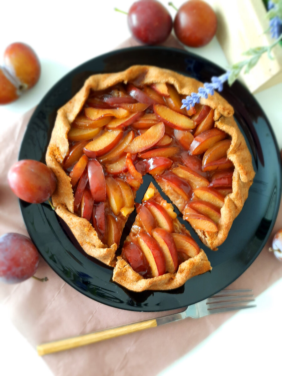 Осенний галета со сливами🍁 Галета — это любой круглый плоский пирог, который выпекается не в форме, а на противне. Галета из цельнозерновой муки не только вкусно, но ещё и очень полезно. Для теста: Мука цельнозерновая 180 гр Сок апельсина 70 гр Кокосовое масло 70 гр Сода 1/2 ч.л. Соль 1/2 ч.л. Начинка: Сливы 300 гр Дополнительно: Кукурузный крахмал 10 гр Панела (натуральный тростниковый сахар) 30 гр (можно кокосовый) Смешать крахмал и сахар 1. Растопить на водяной бане кокосовое масло и сразу добавить сок. 2. Соединить просеянные сухие ингредиенты (мука, сода, соль) и добавить к жидкой. 3. Сформировать из теста шар и поставить в холодильник на 15 минут не больше. 4. Разогреть духовку до 180° 5. Разрезать сливы и убрать косточку, половинки режем на дольки или кому как удобно🙂 6. На пергаменте раскатать тесто в круг 30 см и толщиной 3 мм 7. В центр добавить смешанный крахмал и сахар, затем разложить сливы 8. Край загнуть по кругу и слегка прижимая 9. Выпекать в духовке 2