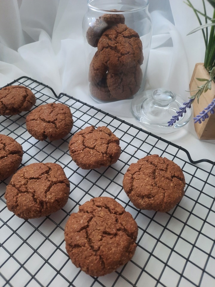 Ингредиенты: Цельнозерновая мука 100 г Овсяные хлопья 150 г Корица 1 ч.л. без горки Соль 1 г Сода 2 г Кокосовый сахар 80 г Кокосовое масло 65 г Яблочное пюре 125 г ( желательно из кислых яблок, домашнее ) 1. Овсяные хлопья измельчить в крошку 2. Ц/з муку просеять и соединить с овсяной крошкой, содой, солью и корицей. 3. Смешать кокосовый сахар с яблочным пюре, хорошо перемешать венчиком и добавить кокосовое масло ( растопленное ) и хорошо перемешать до состояния эмульсии. 4. Добавить сухие ингредиенты и перемешать, вымешивая тесто. 5. Накрыть тесто пленкой в контакт и убрать в холодильник на 20 мин. 6.Скатайте из теста шарики примерно по 50 г, выложите на противень, застеленный пергаментом. Слегка прижмите их к противню не сильно. 7. Выпекайте примерно 20 минут при температуре 180 °C. В заранее разогретой духовке. Печенье должно подрумяниться сверху и пропечься снизу. ( До готовности, зависит от особенностей вашей духовке ) Оставить до полного остывания и наслаждаемся поле