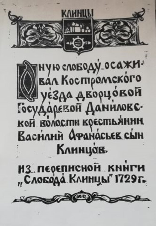 «Оную слободу сначала осаживал Костромского уезду Дворцовой Государевой Даниловской волости крестьянин приселка Николы Хабарова Василей Афонасьев сын Клинцов».