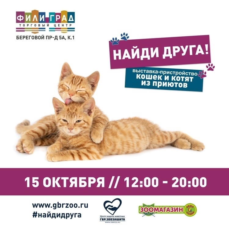 Некоммерческий центр АНО «ГБР.Зоозащита» и ТЦ «Фили Град» приглашает вас на доброе и семейное мероприятие выставку - пристройство кошек и котят из приютов "Найди друга!"