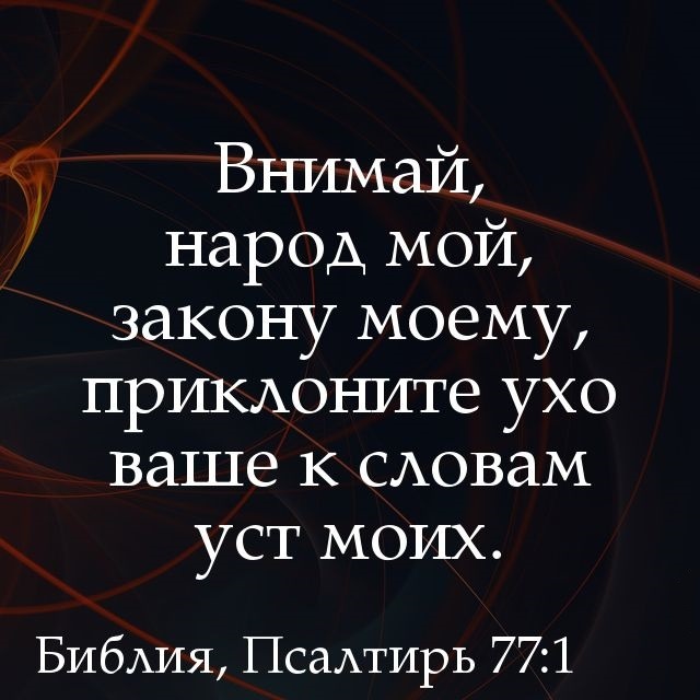 «Внимай, народ мой, закону моему... Открою уста мои в притче, и произнесу гадания из древности. Что слышали мы, и узнали, и отцы наши рассказали нам, не скроем от детей их, возвещая роду грядущему славу Господа, и силу Его, и чудеса Его, которые Он сотворил» (ст. 1-4).
