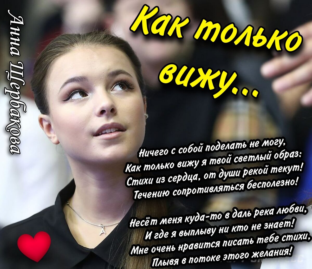 Ничего с собой поделать не могу, Как только вижу я твой светлый образ: Стихи из сердца, от души рекой текут! Течению сопротивляться бесполезно! Несёт меня куда-то в даль река любви, И где я выплыву ни кто не знает! Мне очень нравится писать тебе стихи, Плывя в потоке этого желания! ----- Анна Щербакова . . . . #аннащербакова #александратрусова #камилавалиева #алиназагитова #евгениямедведева #этеритутберидзе #фигурноекатание #аленакосторная #стихи #дарьяусачева
