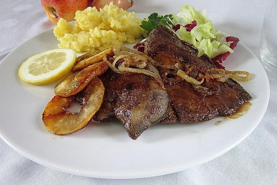 Очень редко публикую рецепты из субпродуктов, потому что не очень их у нас едят. Можно сто раз сказать строго, что печень — полезна, но энтузиазм у семейства все равно не пробуждается. такие вот…капризные. Поэтому готовлю печень крайне редко и всего лишь несколькими способами. Это — один из них. Берем: Как готовим: Лук чистим, нарезаем на полукольца или кольца — как вам удобнее. Примерно ложку масла растапливаем в сковороде и обжариваем в нем лук до приятного золотистого оттенка. Перекладываем лук на тарелку. Яблоки чистим, режем на кольца или полукольца, убираем из них сердцевину. Если масла осталось мало, добавляем в сковородку еще ложку, растапливаем, всыпаем сахар и, когда он чуть изменит цвет, отправляем в сковороду яблоки. Карамелизуем их. Снимаем на тарелку… Печень нарезаем пластами примерно 1 см толщиной, моем, обсушиваем, солим, перчим, обваливаем в муке и, на сильном нагреве обжариваем до появления румяной корочки. Дальше выкладываем на печень яблоки и лук и, все та