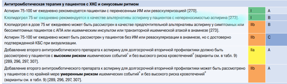 Недавно состоялся очередной европейский кардиологический Конгресс, в серии статей расскажу о некоторых новостях оттуда. Одной человеческой голове просто невозможно вместить всю ту уйму информации, которая озвучивается на таком мероприятии. Но кое-какие крупицы информации, которая может вам пригодиться, я здесь буду приводить. Впервые небольшие преимущества клопидогрела перед аспирином у пациентов с атеросклерозом самой разной локализации (включали больных с ИБС, либо с перенесенным инсультом, либо с симптомным атеросклерозом другой локализации) были давно еще продемонстрированы в исследовании CAPRIE. Исследование это было выполнено еще в конце 90-х. Тогда суммарная частота сердечно-сосудистых осложнений снизилась в сравнении с аспирином на скромные 9%. Это дало основание ввести в клинические рекомендации для больных ИБС вот такую фразу (выделил голубым): То есть считалось, что аспирин - всегда в первую очередь, а уж если пациент не переносит аспирин - ну, тогда уж сгодится клопидогре