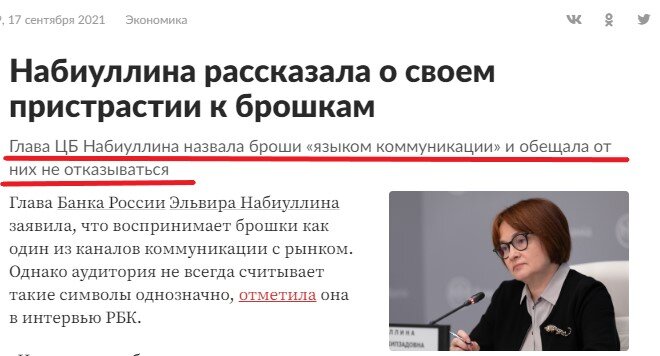 Внимание наблюдателей и критиков главы российского ЦБ на ее выступлениях всегда было приковано к брошкам, которые воспринимаются как некие тайные сигналы о ситуации в экономике или дальнейших действиях регулятора. Сама госп. Набиуллина не отрицает того, что всегда подавала своими брошками определенные сигналы, правда удивляется, как их порой трактовали наблюдатели. Использование этих украшений она назвала "языком коммуникации" и еще в сентябре 2021 года обещала никогда от них не отказываться. Однако это обещание она не сдержала. Потому что после 24 февраля 2022 глава ЦБ ни разу не надевала броши на свои выступления, полностью прекратив их использование. И на последнее заседание по ключевой ставке, на котором эта ставка была понижена до 7,5% глава ЦБ тоже пришла без броши. Журналисты, традиционно обратили на это внимание и задали вопрос главе ЦБ, почему она без броши, и планирует ли использовать броши в своих будущих выступлениях. На что госп. Набиуллина ответила, что "пока не видит ос