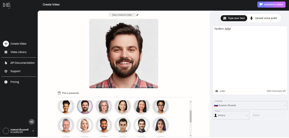 Компания D-ID научила ИИ создавать видеоролики из фото и текста. Приходилось ли вам, как IT-специалистам, иногда надевать парадную футболку и бриться, чтобы выступить спикером на вебинаре? В крупных компаниях это распространённая практика. По понятным причинам не все этому рады, а для кого-то выступить публично — вообще что-то за гранью добра и зла. Кажется, теперь можно выдохнуть! Создатели проекта Deep Nostalgia (вы наверняка о нём слышали, ИИ оживляло ретро-снимки), израильская компания D-ID, запускает новую платформу. Проект очень интересный и перспективный, он позволяет юзерам загружать изображение (портрет) и текст, из которых искусственный интеллект генерирует видео. Проект должен помочь в сфере корпоративного обучения, образования, маркетинге и т.п. Пользоваться платформой очень просто. Сначала нужно загрузить фото докладчика или выбрать портрет из встроенной галереи. Те, кто купил платную подписку, получают доступ к альбому с премиум докладчиками, у которых лучше выражены лица