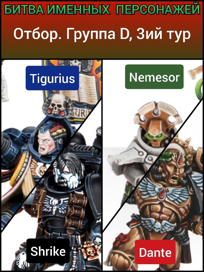 Всем здорова! Вчера весь день был за городом, поэтому поста не было, завтра работаю, думаю наверстать это всё в выходной и выпустить по одному посту каждой рубрики, даже несмотря на недовольство жены) А сегодня у нас середина 4ой отборочной группы и давайте же на неё взглянем) 3ий тур (Гримнар отдыхает) Матчи тут довольно предсказуемые, если Тигурию не подфартит на кубах Тигурий - Шрайк И ему таки разок подфартило, что попортило свип Ворону. В остальном победитель был очевиден) Итог: 0-2(29) Немесор - Данте Бедолага Немесор распался на атомы от одного присутствия легендарного Астартес. Но пару раз его укусил за щиколотку и на покой в следующем туре) Итог: 0-3(43) 4ый тур (Немесор отдыхает, бедолага😅) Первый тур в котором участвуют все Магистры, ну и амбиции их понятны) Шрайк - Данте В битве кучи атак победил мельта-пистолет Данте. Если Шрайк его не добивал (а в этом матче это было всегда) мельтарэнджовый урон просто сдувал любителя чёлок Итог: 0-3(34) Тигурий - Гримнар (3) А вот от ко