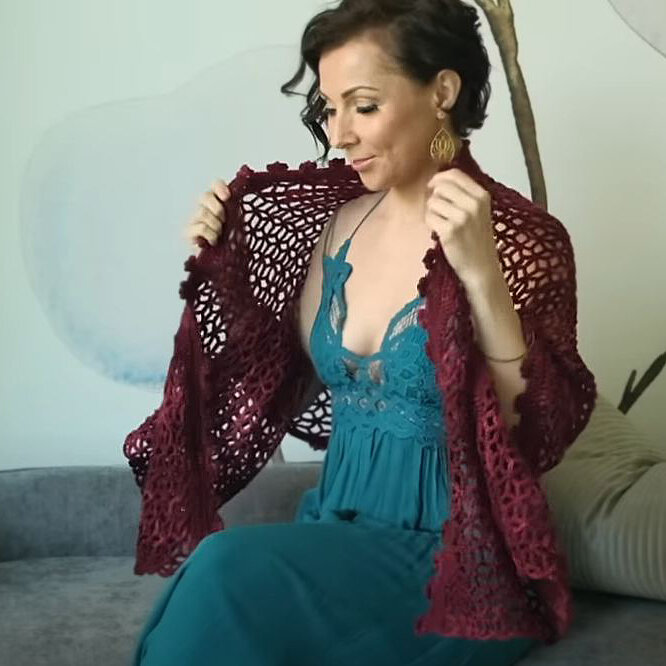 Но зато в ней можно роскошно сидеть в уютном кресле в своем доме, читая книгу, прогуливаться по парку или саду, в конце концов в ней можно с удовольствием сварить кофе с утра. И если вам нравится шаль крючком, которую мы сегодня представляем, нужно обязательно вязать! Модель простая, медитативная для опытных вязальщиц и по силам начинающим рукодельницам. Вяжем? Да-да, это отличный проект, если в сложные проекты вам окунаться очень не хочется, а хочется, чтобы было просто и быстро. Ну и красиво! Фантастика? Отнюдь. Есть такие узоры, которые вяжутся легко, запоминаются мгновенно, не требуют особых приемчиков. Сегодня речь пойдет именно и подобном варианте. Шаль крючком, которую вы видите на фотографии, связана ажурным узором, рисунок которого напоминает стилизованные цветы. Узор называется «Кассия», вы видите стилизацию цветочных грозд