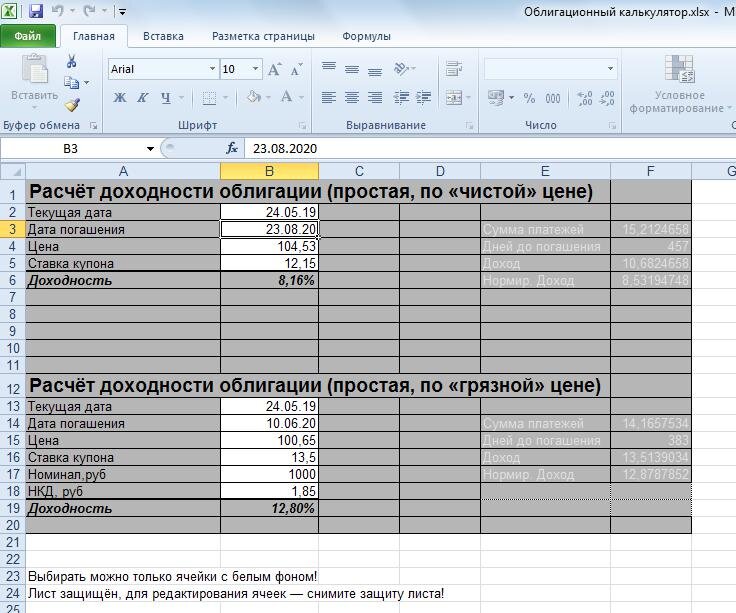 Работа с облигациями сопряжена с нечастыми, несложными, но весьма кропотливыми вычислениями. Каждый раз, когда требуется совершить операцию с облигацией (будем говорить о покупке), необходимо определить, насколько выгодной она будет. Например, если облигация продаётся по 103%, ставка купона — 12% годовых и до погашения три года, то такая облигация может быть выгодным вложением. А если облигация продаётся по 103% со ставкой купона 7% годовых и до погашения осталось несколько дней, то такие вложения приведут к потере денег. Для определения того, выгодной будет покупка или нет, я ориентируюсь на простую доходность к погашению. Обсуждение того, какие виды доходностей облигаций бывают и почему я использую именно эту, оставим за пределами данной статьи. Далее по тексту, если не оговорено иное, я подразумеваю простую доходность к погашению и облигации, номинированные в рублях.