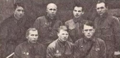 Для фона кто-то принес парусиновый чехол. А через день-два снимок действительно появился в газете. На нем стоят слева направо: заместитель командира эскадрильи старший лейтенант Василий Бедкин, штурман эскадрильи старший лейтенант Борис Плоткин, штурман звена лейтенант Алексей Зайцев, командир звена лейтенант Иван Кочетов, сидят — летчик — старший сержант Николай Шмелев, летчик старший сержант Юрий Сорокин и адъютант эскадрильи, старший лейтенант Владимир Тычков.