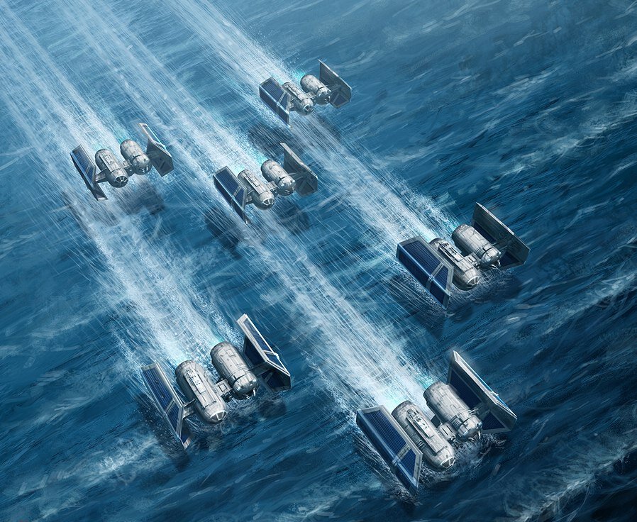 На рисунке, в паре метров над поверхностью воды, скользит два звена СИД Бомбардировщиков из элитной бомбардировочной эскадрильи «Гамма». До выхода на цель им осталось несколько минут. Еще несколько минут, и они откроют на базе Альянса Повстанцев маленький филиал ада, сжигая сотни мятежников в огне плазменных и протонных бомб. Разумеется, так подходить к цели рискованно, но зато позволяет избежать обнаружения вражескими средствами ПВО.