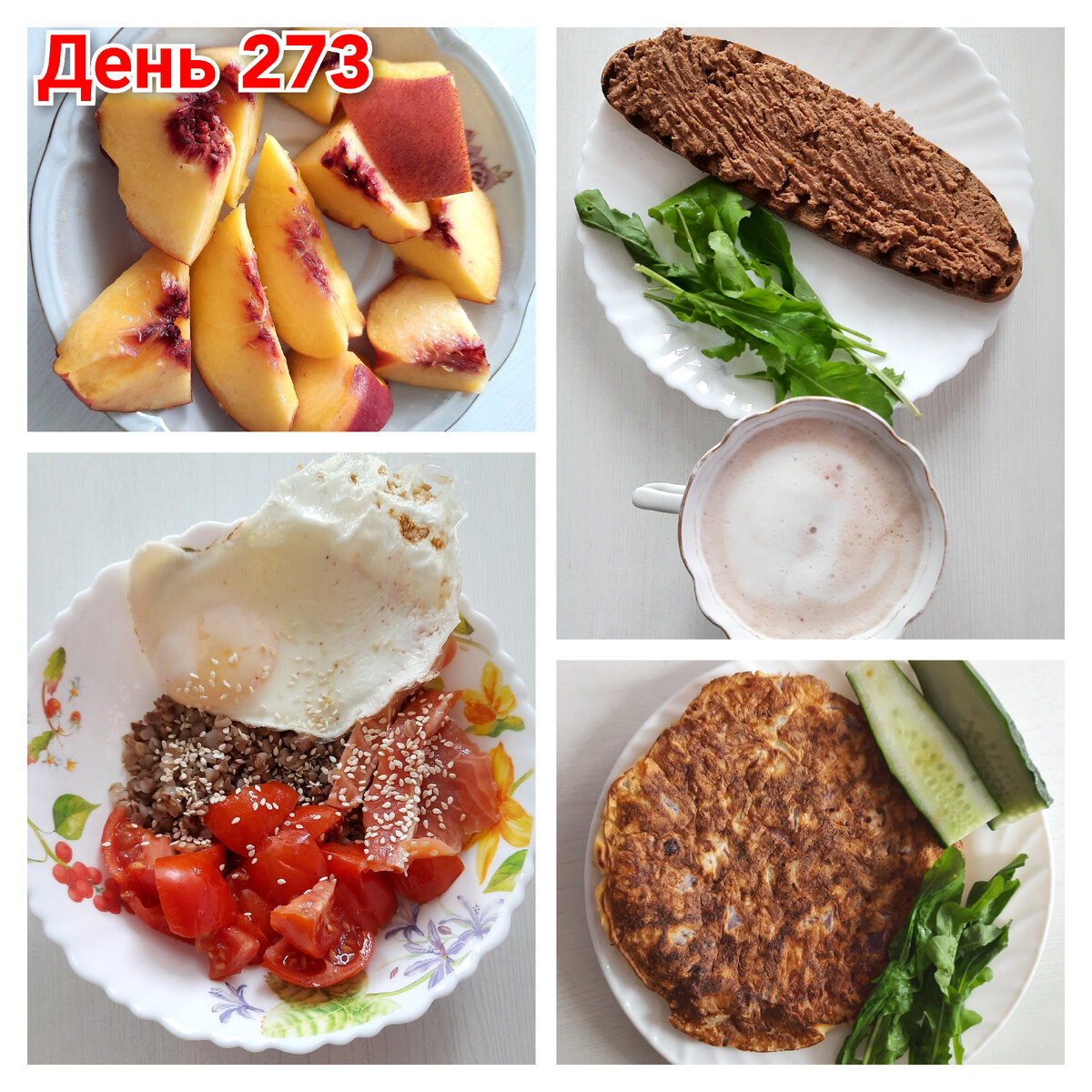 #Завтрак – кофе со сливками и сахаром 7г. Руккола с огорода. И да, у нее могут вырастать вот такие здоровые листья! В магазине продаются какие-то мелкие листочки и не такие яркие по вкусу. Эта очень сочная, пряная и насыщенная по вкусу. Удивительно, как лет 5 назад я первый раз попробовала рукколу и она мне абсолютно не понравилась, а теперь одна из любых из зелени. А как Вы относитесь к рукколе? Хлеб на гриле и паштет из печени кролика от местного фермера. #Обед – боул с гречкой. Модное название и модное сочетание. В глубокую тарелку снизу выкладываю гречку, поливаю оливковым маслом, чтобы было вкусно и сочно. И далее идет то, что есть в наличии в холодильнике. У меня здесь порезанный помидор, слабосоленая форель несколько слайсов. Пожарила 1 яйцо в виде глазуньи. И все это посыпать семенами кунжута. Эстетически интересное блюдо. Наверно, тут все решает кунжут))) #Десерт – порезанный персик. #Ужин – #кабачковаялепешка с карпаччо, огурец и руккола. Для лепешки - 1 яйцо+30г муки+60г нат