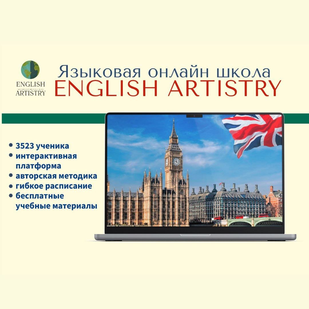 Мы онлайн-школа английского языка English Artistry 🇬🇧 Наша школа в цифрах: •3523 ученика по всему миру; •1291 ученик связали свою жизнь и работу с 🇬🇧; •5 преподавателей, сертифицированных Кембриджским университетом. Что мы предлагаем: • Занятия для студентов от 5 лет и до бесконечности; • Эффективные образовательные программы для каждого возраста; • Своя интерактивная платформа, где наши студенты обучаются увлекательно и легко; • Авторская методика занятий от нашего руководителя, которая даёт первый результат за 1 месяц; • Бесплатные учебные материалы; • Занятия онлайн, не нужно тратить время на дорогу; • Гибкое расписание; • Занятия индивидуально или в группе. Расскажите о себе Как вас зовут? Из какого вы города? Как вы изучаете английский? Мы очень рады нашему знакомству You are welcome 🤗