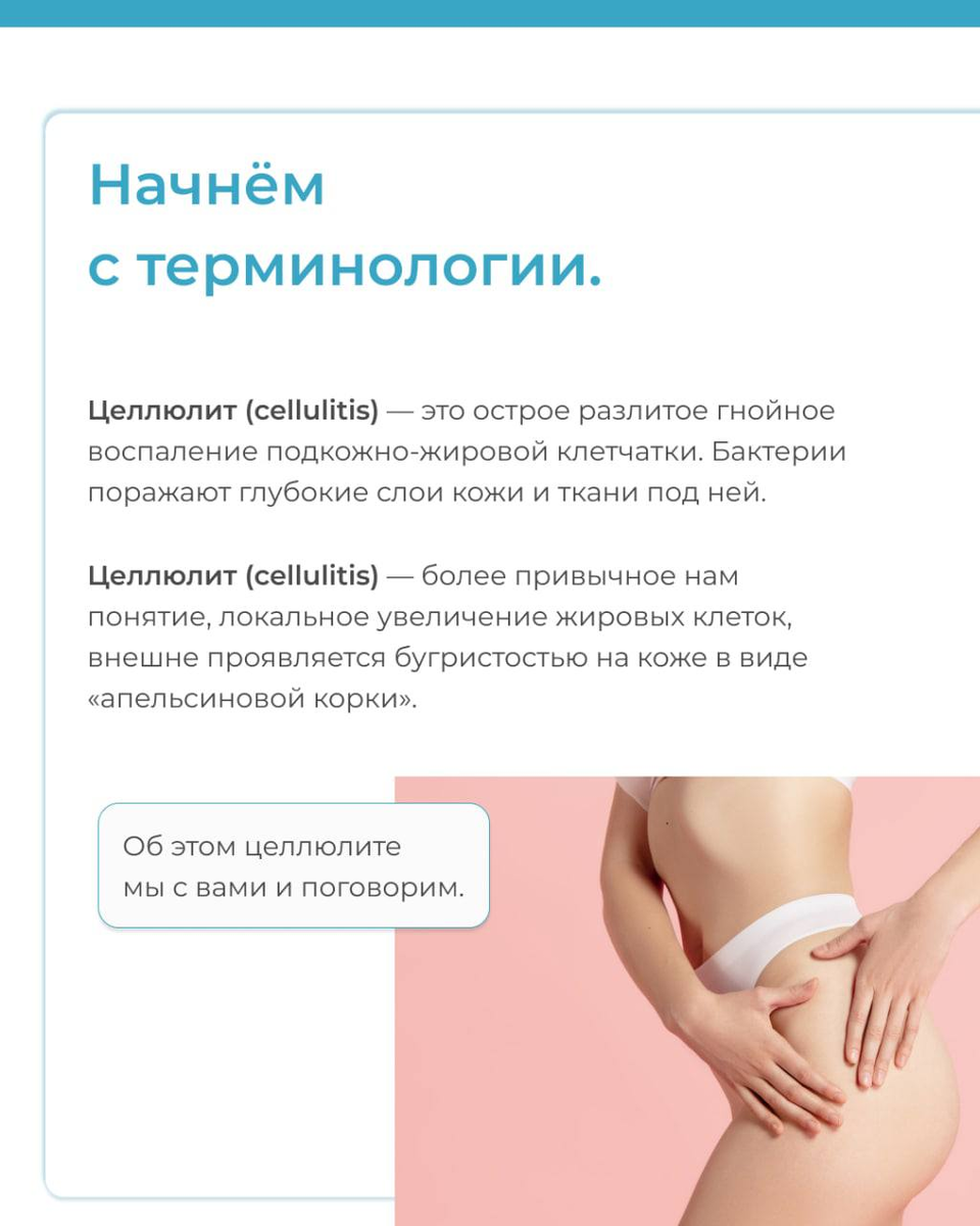 Про целлюлит с точки зрения науки🧬 Я знаю, вы ждали этот пост🔥 Поехали: ✨Целлюлит НЕ является заболеванием, не входит в международную классификацию болезней и не требует лечения. Вопрос исключительно эстетический. ✨Целлюлит может поражать и мужчин и женщин, но чаще встречается у женщин. ✨От 80 до 90% женщин сталкиваются с целлюлитом в определенный момент своей жизни, чаще всего это происходит после полового созревания. Тут я хочу вам подчеркнуть: ДО 90% женщин! 9 из 10!!!!! ✨Точная причина возникновения целлюлита не известна, но есть предрасполагающие факторы: ▫️пол ▫️возраст ▫️генетика ▫️образ жизни ▫️масса тела ▫️гормональные факторы: целлюлит усиливается во время беременности, кормления и менопаузы Итак, как же его убрать? В данном направлении постоянно проводятся исследования, поэтому я вам напишу методы, которые прокомментировала Американская Академия Дерматологов: 👉🏻Ударно-волновая терапия. Метод основывается на акустических волнах. Исследования показывают, что несколько с