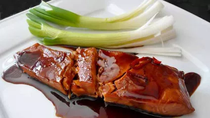 1 ст. л. раст. масла для обжаривания КАК ГОТОВИТЬ: 1. Смешать все компоненты для маринада - размешивать до растворения сахара. 2. Куски лосося промыть, обсушить, положить в маринад приблизительно на 20 мин. Периодически переворачивать. 3. Духовку разогреть до 150°С. 4. Вынуть рыбу из маринада, обсушить салфеткой и быстро обжарить на смазанной маслом сковороде с антипригарным покрытием. 5. Сложить в огнеупорную форму, поставить в духовку на 15-20 минут – в зависимости от то
