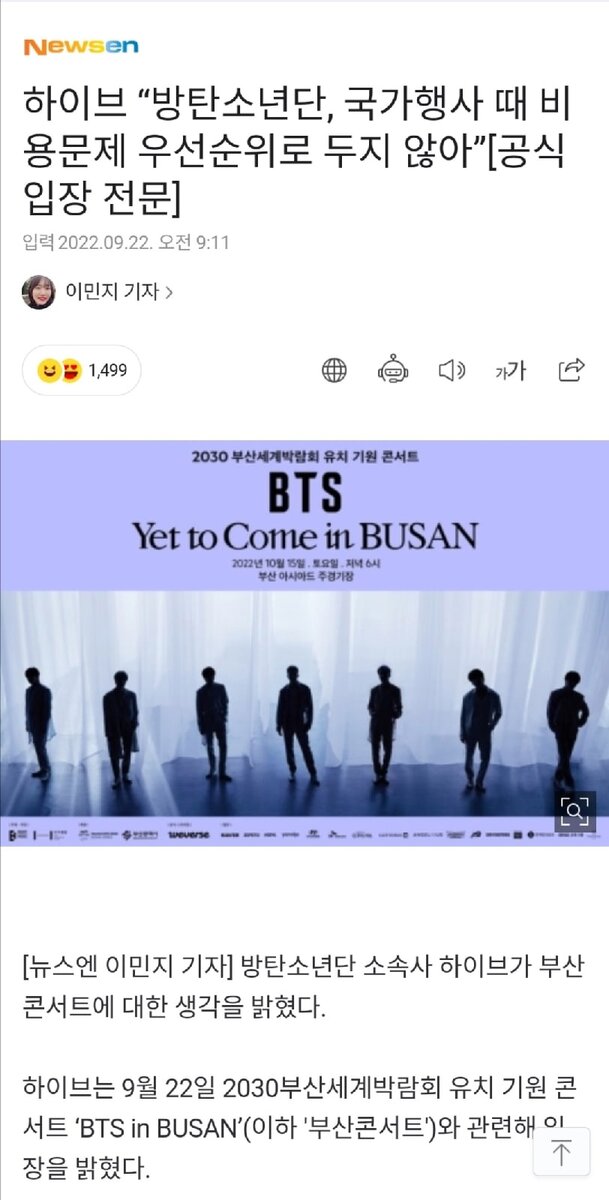 Мы пишем, чтобы выразить нашу позицию относительно концерта BTS 'Yet To Come' in BUSAN 2030 Busan World Expo Bid (далее "Пусанский концерт"), который состоится 15 октября на главном стадионе Busan Asiad. Прежде всего, в ответ на вопросы СМИ о стоимости концерта в Пусане, мы уже заявляли, что расходы будут значительными, и значительная часть этих расходов будет покрыта за счет корпоративного спонсорства, потоковой онлайн-рекламы, а также дочерней компании проекта "THE CITY". Кроме того, мы также сообщили, что компания решила оплатить разницу, которая не может быть покрыта даже при наличии финансовых ресурсов. BTS также выступят на этом концерте без отдельного гонорара, что будет сделано таким образом, чтобы воплотить прошлую идею артиста о желании выступить бесплатно перед большим количеством поклонников. Несмотря на эти объяснения, мы сожалеем, что вокруг концерта в Пусане разгорелись споры, и хотели бы подробно разъяснить наши мысли. Вместо того, чтобы концентрироваться на затратах при участии в национальных мероприятиях, HYBE и BTS сосредоточились на достижении достойных результатов. Наша компания и BTS участвуют в национальных мероприятиях, больших и малых, с прошлого. Мы участвовали в мероприятиях, чтобы внести свой вклад в развитие страны и общества, и не ставили вопрос о расходах во главу угла. Мы прекрасно понимаем, что правительству трудно в достаточной мере покрывать расходы на мероприятия. Кроме того, мы всегда подходили к вопросу государственной поддержки очень осторожно, потому что источником государственной поддержки являются деньги налогоплательщиков от народа. То же самое можно сказать и о расходах на этот концерт в Пусане. Правительство, местные органы власти и тендерный комитет делают все возможное, чтобы поддержать этот концерт, не только предоставляя концертную площадку, но и вкладывая ресурсы при ограниченном бюджете. Кроме того, мы считаем, что нежелательно/не благоприятно, чтобы ресурсы правительства, местных органов власти и корпораций, которые прилагают все усилия для заявки на проведение Всемирной выставки 2030 года в Пусане, были использованы или истощены в больших масштабах из-за концерта в Пусане. Если бы BTS считали стоимость самым важным фактором при участии в национальных мероприятиях в прошлом, было бы очень трудно добиться всех этих многочисленных результатов на крупных мероприятиях для нашей страны и для всего мира. Наша компания сосредоточилась на процессе создания высококачественных результатов на всех мероприятиях, в которых участвует BTS, и мы долгое время считали, что это достаточно значимо, потому что мы были удовлетворены результатами, которые мы создавали вместе с BTS. Однако есть одна вещь, от которой мы не можем отказаться. И это качество сцены BTS (дословный перевод: это уровень сцены, на которой стоит BTS). Присутствие лучших артистов мира на национальном мероприятии не означает, что можно ставить под угрозу качество/уровень сцены. Этот концерт в Пусане ничем не отличается от других. Мы сосредоточимся только на том, чтобы убедиться, что высокие стандарты соблюдены, и добиться наилучших результатов не только на сцене стадиона "Busan Asiad Stadium, где будут стоять BTS, но и на всех различных мероприятиях. Создать невероятный концерт, которого мы ожидаем, и через это помочь заявке на проведение Всемирной выставки в Пусане в 2030 году, 