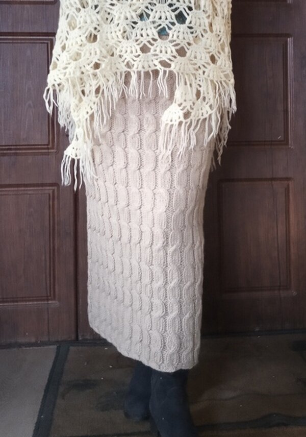 (В конце статьи я рассказываю о достоинствах и недостатках модели) Мне понадобилась теплая однотонная юбка сразу после того, как я сообразила, что юбка-пэчворк (см. здесь https://dzen.ru/media/id/61d03d6d0b8f8f63eeda63f6/zimniaia-iubka-v-tehnike-pechvork-632c8bb9683caa4afbbb093c ) подходит не для всякой верхней одежды ). Захотелось светлую. И еще хотелось, чтобы юбка держала форму и не вытягивалась. Решено было вязать мелкими косами. Размер юбки 48 (обхват бедер 102 см) Пряжа 50% шерсть, 50% акрил 100 гр/200 м. Пряжа российская, фабрика, возможно, Пехорка Мериносовая, точно не помню. Спицы круговые 3 Ушло около пятисот граммов. Плотность вязания лицевой глади (после ВТО): 15 петель = 10 см 22 ряда = 10 см Вязание идет сверху вниз, вкруговую и начинается с пояса. Ширина пояса примерно 4 см, чтобы можно было плотно вставить широкую резинку. Для уменьшения объема юбки на животе от пояса до бедер вязала кокетку лицевой гладью. Пояс. Набрать 162 петли 1-9 ряды: лицевая гладь. Это изнанка