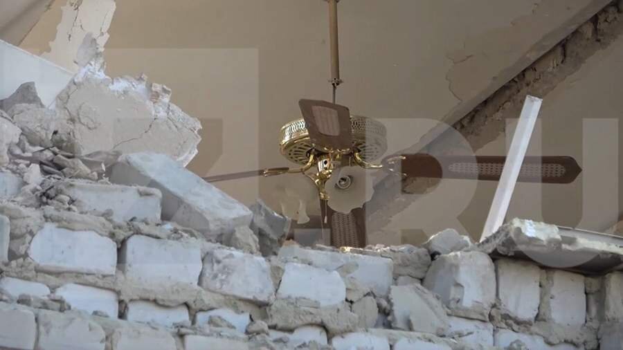 «Здесь залетело. Он [снаряд] прошел сверху. Здесь… была поликлиника, амбулаторный прием, диагностические кабинеты, физиотерапевтическое отделение», — сказал главврач, демонстрируя разрушения.