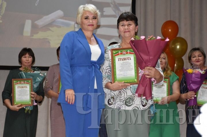 На большой праздник, организованный в районном Доме культуры по случаю Дня учителя, были приглашены учителя, воспитатели и ветераны этой отрасли. Сегодня в образовательных учреждениях района работают более 500 педагогов. Безусловно, в зрительном зале Дома культуры невозможно всех вместить, однако сегодня, наверное, ни один учитель не остался без внимания. Гостей праздника поздравили руководитель района Рамиль Айбатов и начальник отдела образования Ольга Маркова, пожелали им успехов в их беспокойной и ответственной работе. За многолетний добросовестный труд и значительные заслуги в образовании Рамиль Талгатович вручил учителю русского языка и литературы Черемшанского лицея Гулюсе Закировой, заместителю начальника районного отдела образования по воспитательной работе Флере Рахимзяновой, воспитателю детского сада «Родничок» (Черемшан) Анисе Сибгатуллиной, учителю начальных классов Черемшанского лицея Галине Скворцовой, учителю начальных классов Черемшанской средней школы №1 Людмиле Сурков