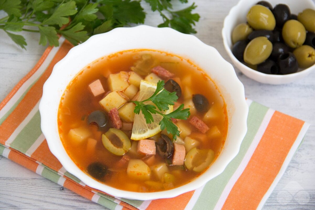 Подавайте готовую солянку с кусочками лимона и петрушкой.