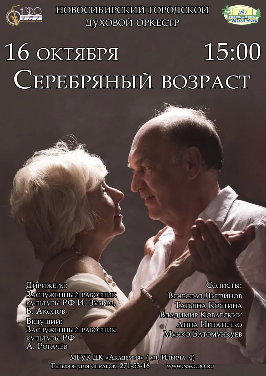 Новосибирский городской духовой оркестр и ДК "Академия" приглашают на концертную программу, посвящённую Международному дню пожилого человека! В начале октября 1991 года появилась прекрасная традиция отмечать День пожилого человека - праздник добра, зрелости, мудрости и уважения к людям почтенного возраста!