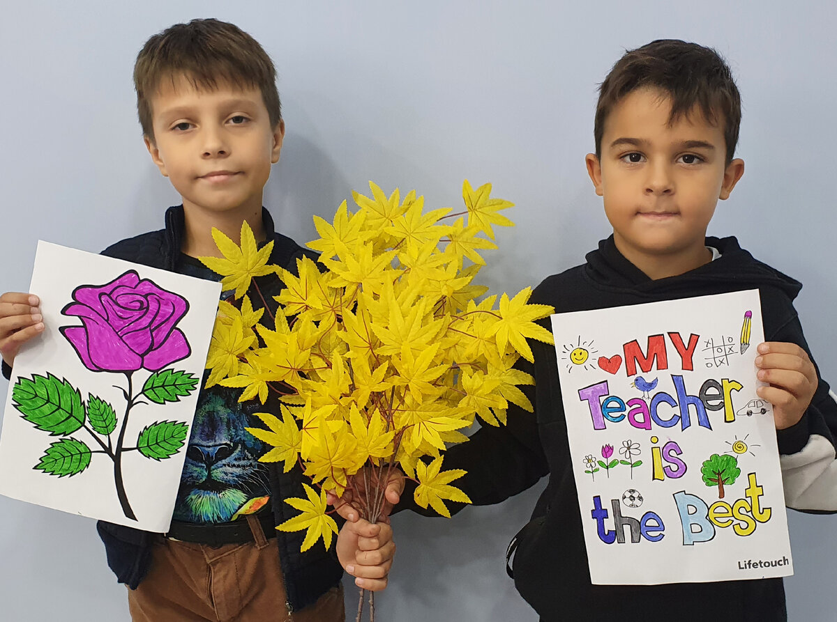 Учащиеся ТО «Занимательный английский» (рук. Залещук Елена Вячеславовна) и ТО «Английский с удовольствием» (рук. Чемезова Алёна Сергеевна) поздравляют всех педагогов с Днем Учителя! Спасибо Вам, учителя! За мудрость, доброту и за терпение Сегодня от души благодарим! Здоровья, вдохновенья и везения Вам пожелать мы искренне хотим!
