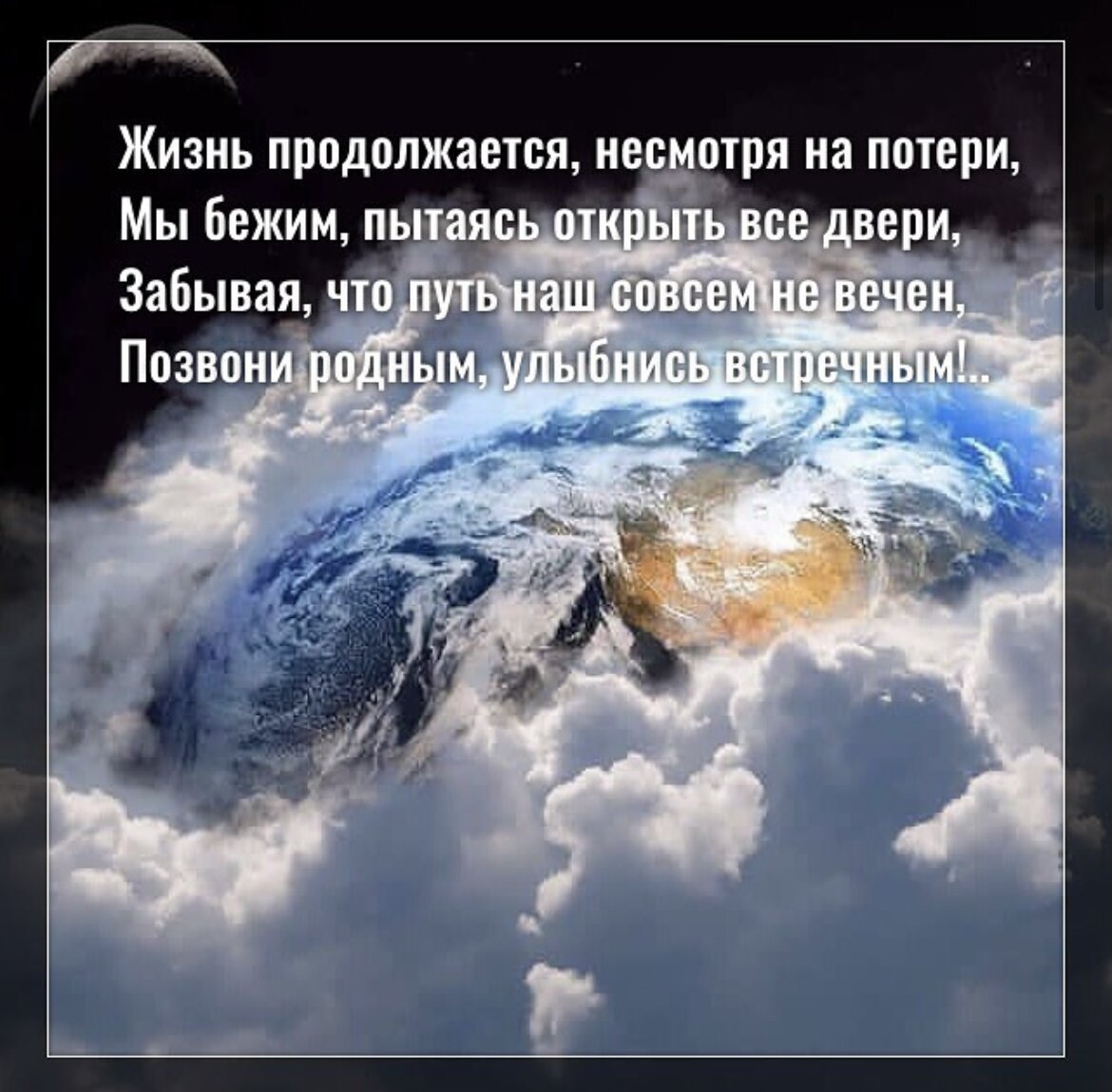 Жизнь продолжается, Несмотря на потери, Мы бежим, пытаясь открыть все двери, Забывая, что путь наш совсем не вечен, Позвони родным, улыбнись встречным! Не так много времени на все наши планы, Сделай шаг сегодня, не расчесывай раны! Что пугает тебя? А если завтра не будет? Кто помянет тебя? Кто тебя не забудет? Ты живешь как зверь или Душой открыт? Помоги кому-то, кто всеми забыт! Излучая свой свет, проживай каждый миг, Оставляй свой след, пока тебя не настиг Твой последний вздох и красавица смерть, Мы не вечны, запомни, нас так просто стереть, Но не из памяти Душ, кому оставил тепло, Не из сердца людей, кому с тобой повезло Хоть немного коснуться твоей красоты, Глубины твоих чувств и добра высоты. Будь лоялен к миру, живи любя, И оставь в нём на память себя...