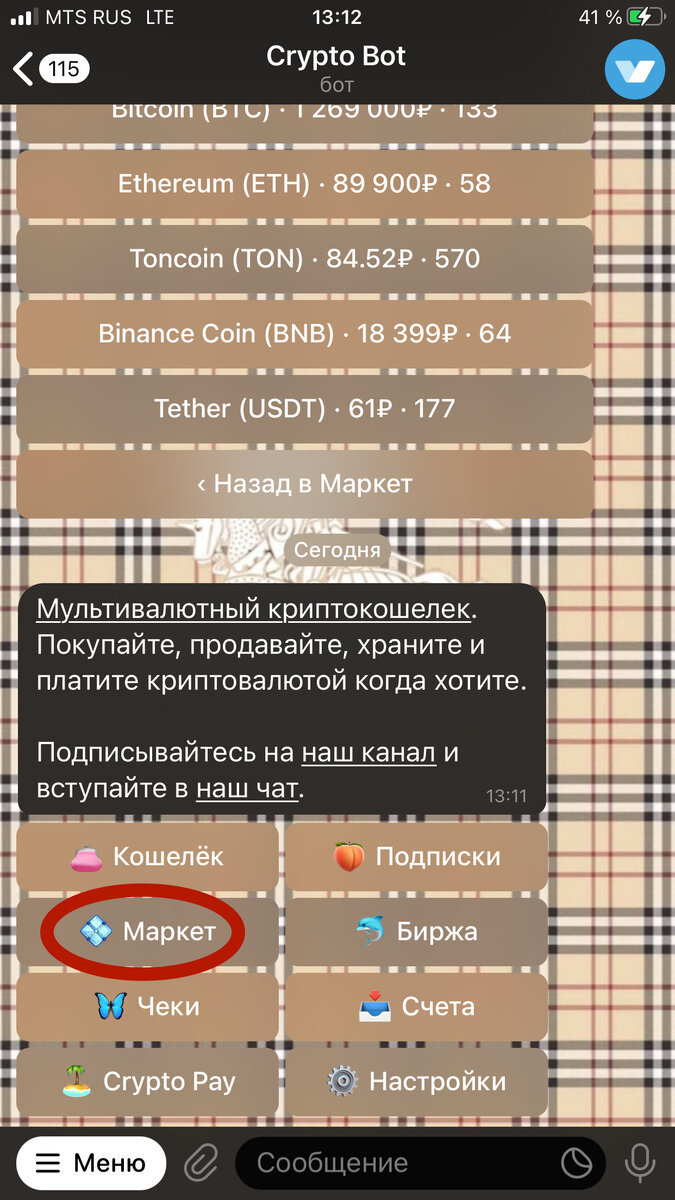 Заходим в Телеграмм бота «Cripto bot» Затем выбираем Маркет После чего нажимаем купить Выбираем интересующую нас криптовалюту ( в нашем случае toncoin) Выбераем способ оплаты который вам удобнее Затем выбераем продавца После того как выбрали, нажимаем купить TON Вводим суму на которую мы хотим приобрести TON и создаём сделку После того как продавец примет сделку, вам придут его реквизиты, переводите сумму ту которую указали, нажимаете оплата отправлена и в течение 10 минут вам зачислят toncoin. После чего нажимаете на кошелёк Выбераем пункт вывести Нажимаем на интересующую нас валюту После чего заходите в ваш криптокошелёк и нажимаете получить копируем адрес кошелька После чего вставляем скопированный текст в телеграмм бота crypto botи указываем сумму которую хотим вывести