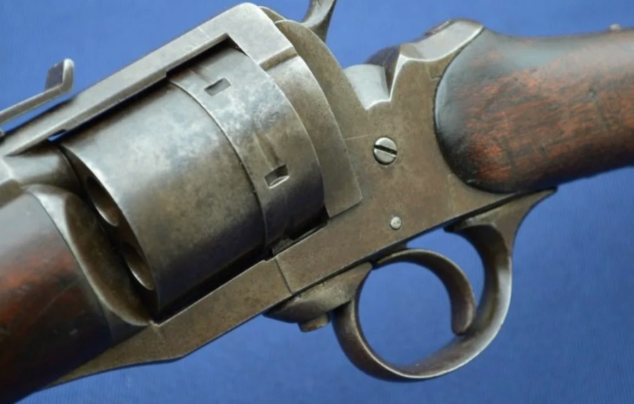 Сегодня мы кратко рассмотрим одну очень интересную модель винтовки — револьверный карабин Луи Перрина. Этот образец был создан в 19 веке во Франции. Можно сказать, что это револьвер, имеющий приклад и удлинённый ствол. Впрочем, стоит учитывать, что есть и иные отличия, а так же модификации не только у самого револьвера, но и у карабина, который создан на его базе. Данная модель отличалась шестью зарядами в барабане, и имела ударно-спусковой механизм двойного действия. Таким образом, выстрел осуществлялся всего лишь после нажатия на спусковой крючок, без предварительного взведения курка. Собственно, данный образец появился исключительно из-за контракта с армией. Учитывая отказ французской армии от револьвера, что является базой карабина, со стороны конструктора это был очень смелый шаг. Однако в итоге армия все равно отказалась от данной модели из-за 11-миллиметрового патрона Перрина. У ружья было достаточно мощности, если рассматривать его как гражданское оружие ближнего боя, однако