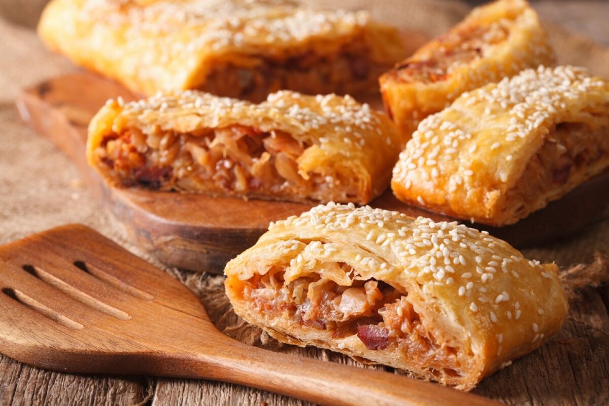 Ингредиенты Пошаговый рецепт приготовления Мелко нарежьте сосиски и пару минут обжарьте. Добавьте нашинкованную капусту и тушите до красивого коричневатого цвета на среднем огне. Приправьте. Раскатайте и нарежьте тесто, выложите начинку и защипните края слоек. Смажьте тесто взбитым яйцом и посыпьте кунжутом. Выпекайте в духовке 20-25 минут при 190 градусах.